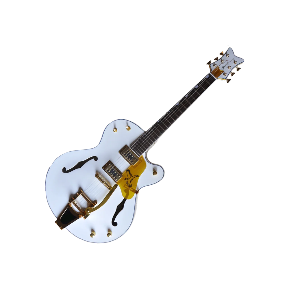 Bienvenue dans le monde de la guitare de légende ! Si vous êtes un fan de rockabilly, de jazz ou de tout simplement de guitares épiques, vous ne pouvez pas passer à côté de notre réplique de la Gretsch White Falcon utilisée par Brian Setzer.